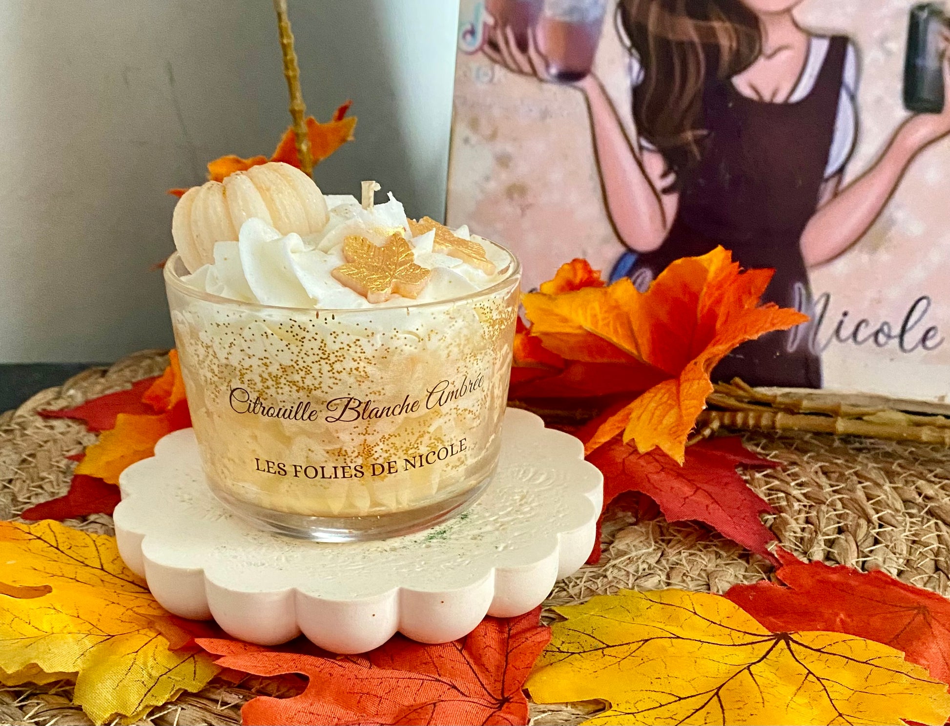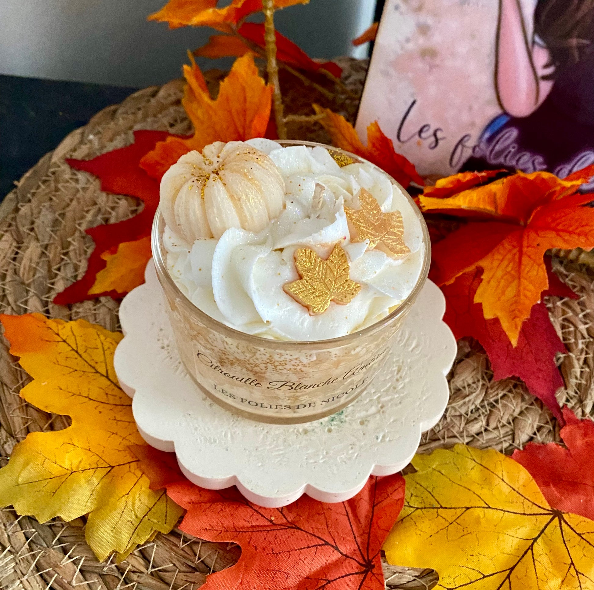 Élégante et raffinée, cette bougie met à l’honneur l’automne dans une version chic et lumineuse. Son topping généreux de crème blanche, ses petites feuilles dorées et sa citrouille blanche délicatement posée apportent une touche féerique et chaleureuse à ta décoration.