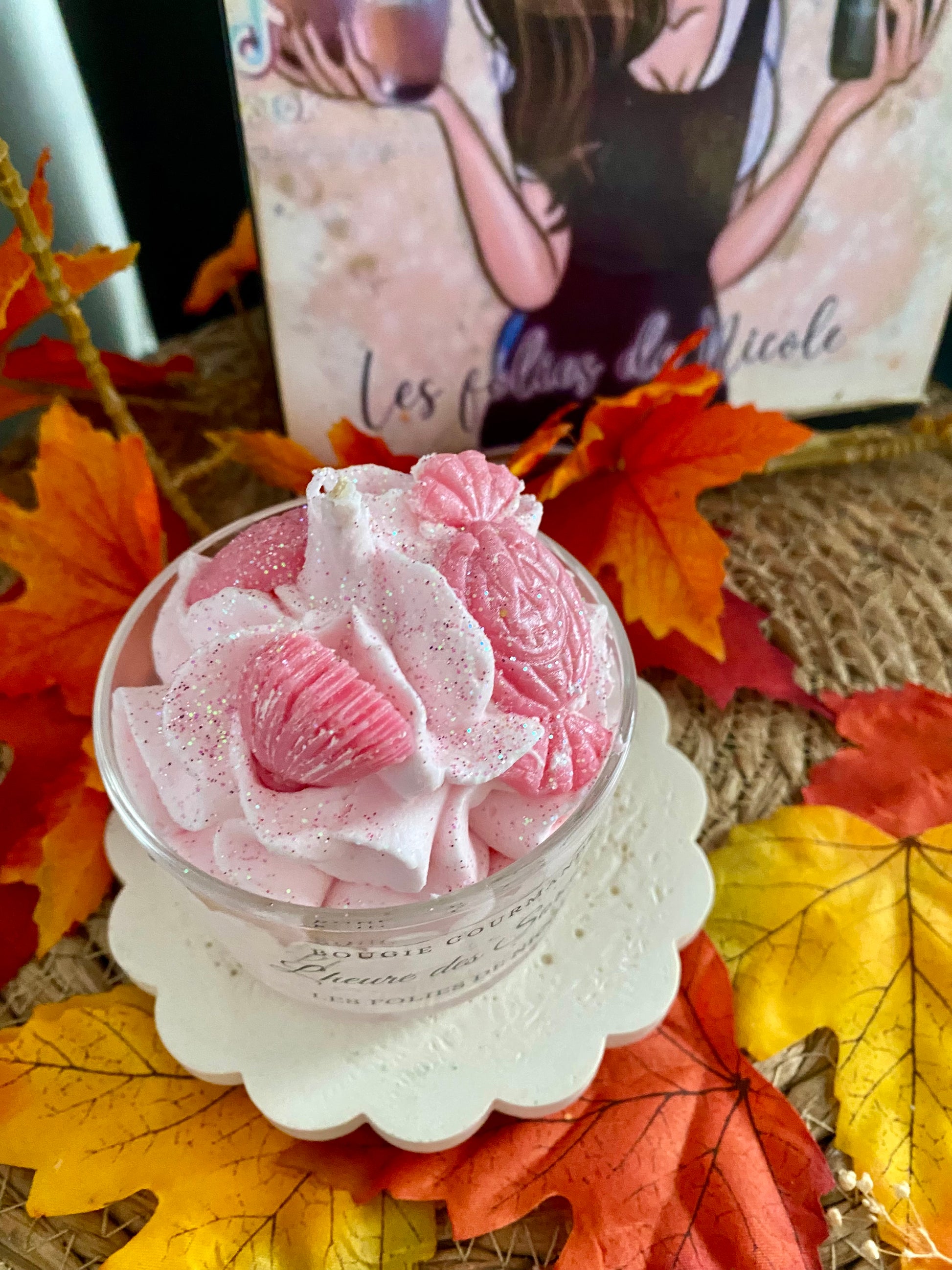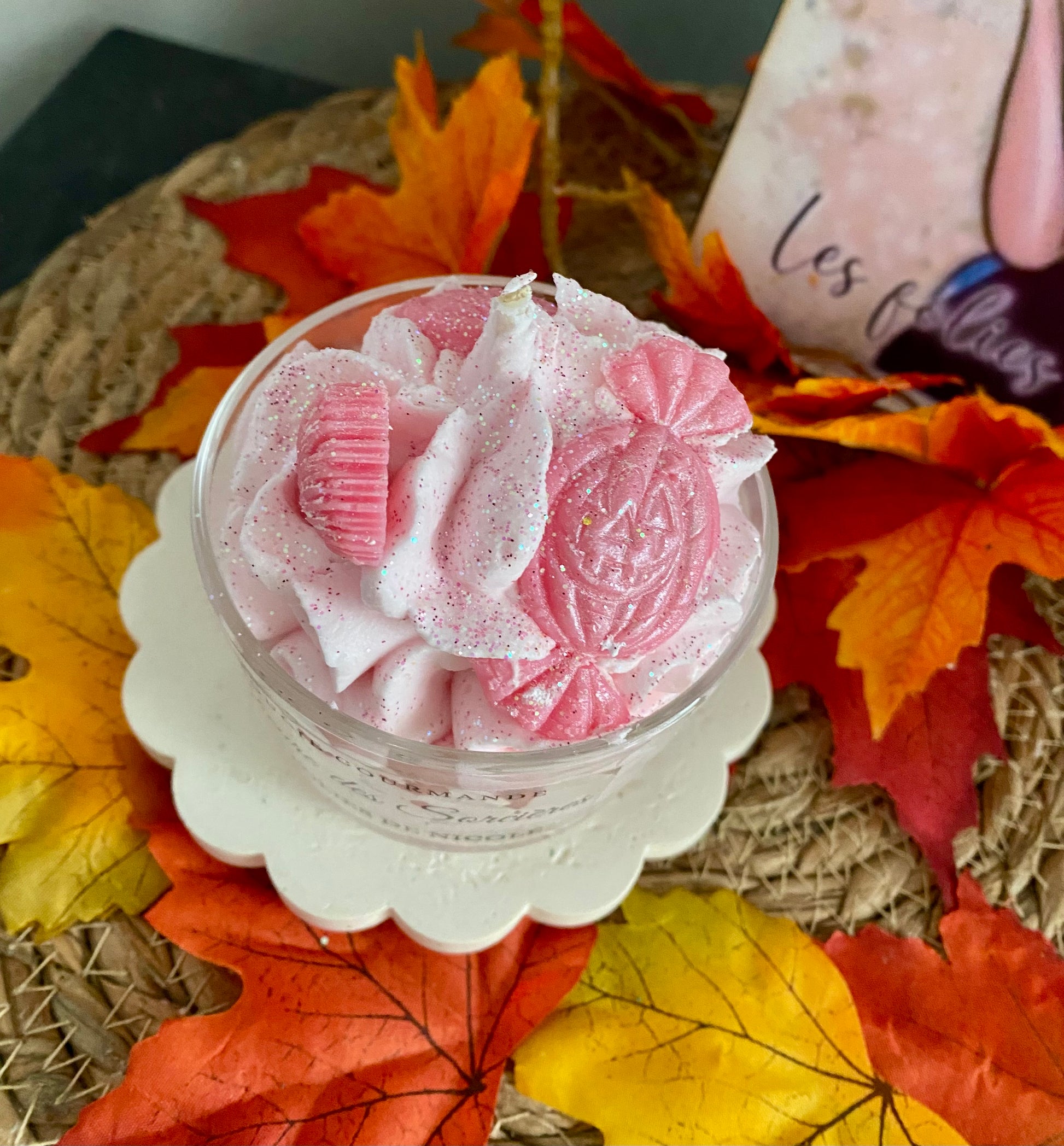 Coulée à la main, elle est décorée d’une chantilly rose scintillante et de petits bonbons en cire. Le choix du rose est volontaire, pour apporter un côté enfantin et ludique, comme une montagne de sucreries tout droit sorties d’un sac de bonbons d’Halloween.