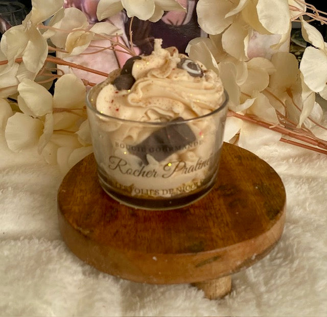 "Plongez dans un nuage de douceur avec notre bougie gourmande rocher praliné . Son parfum riche et onctueux marie à la perfection les arômes profonds du chocolat fondant à la subtilité croquante des noisettes grillées. Chaque flamme libère une chaleur réconfortante, créant une ambiance enveloppante et délicieusement sucrée, idéale pour les amateurs de plaisirs chocolatés. Invitez la gourmandise chez vous et laissez cette bougie transformer votre espace en un véritable cocon douillet, propice à la détente et à la gourmandise."