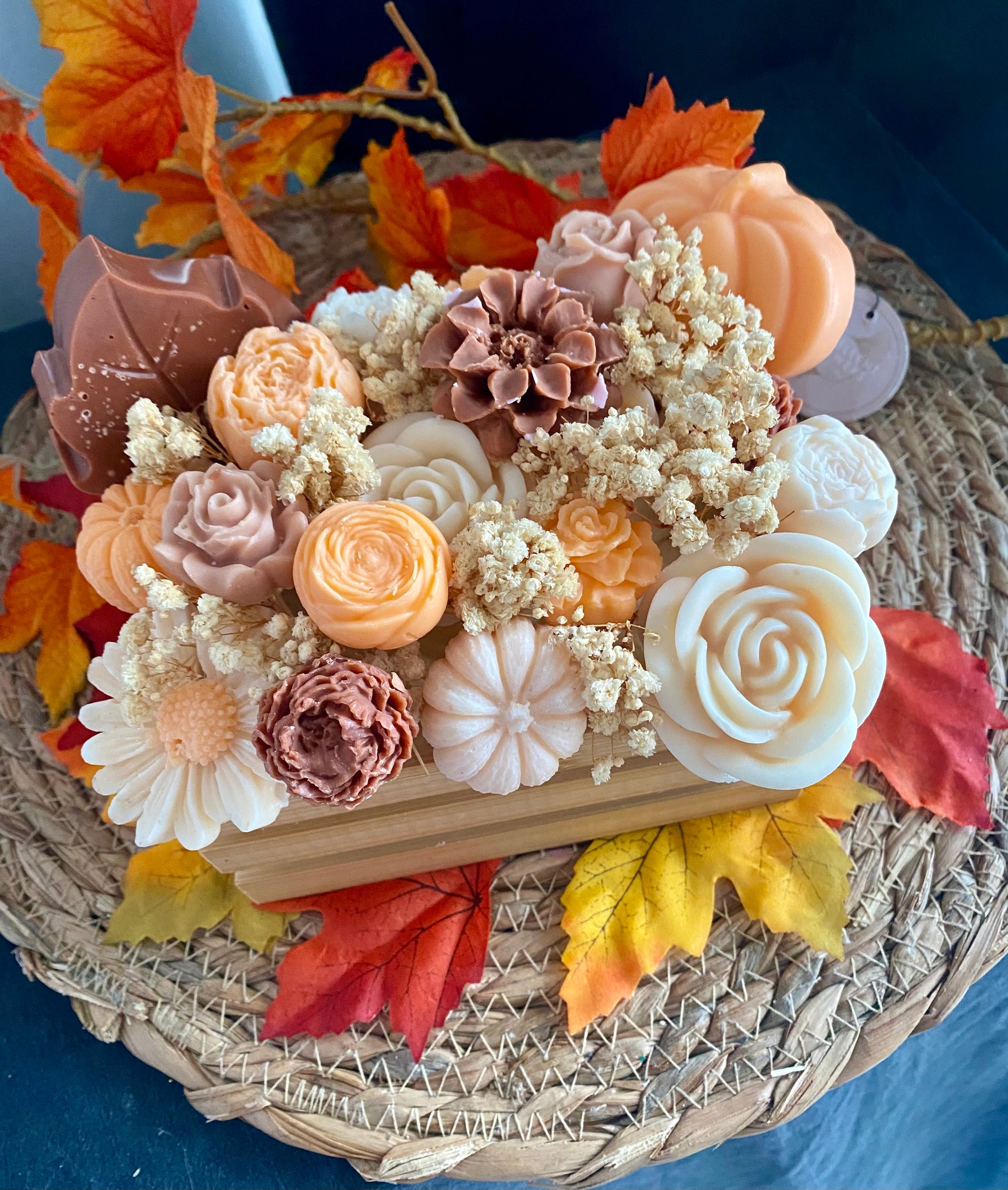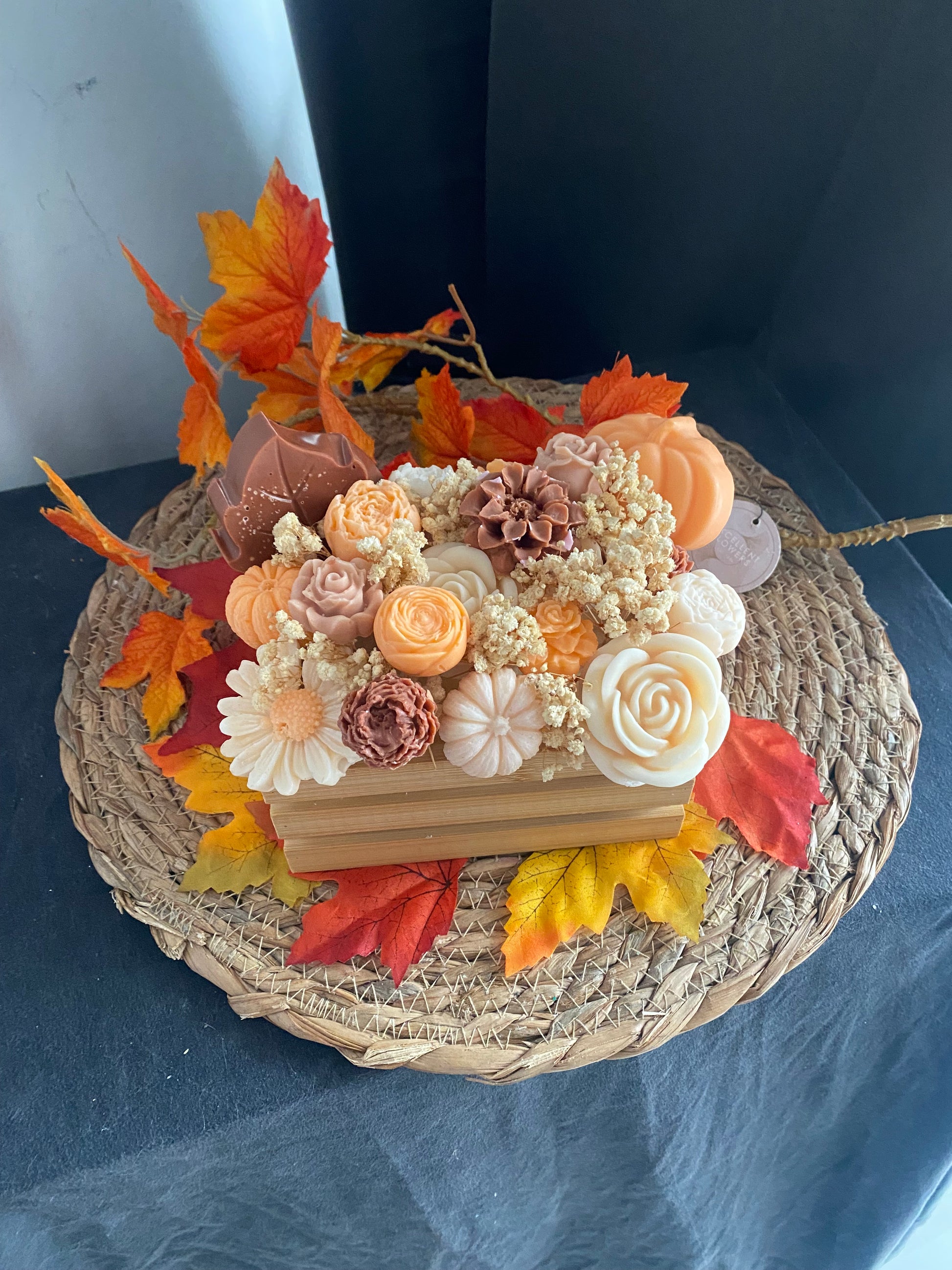 Laissez entrer la magie de l’automne dans votre intérieur avec cette box artisanale en bois garnie de fondants parfumés en forme de citrouilles et de fleurs.