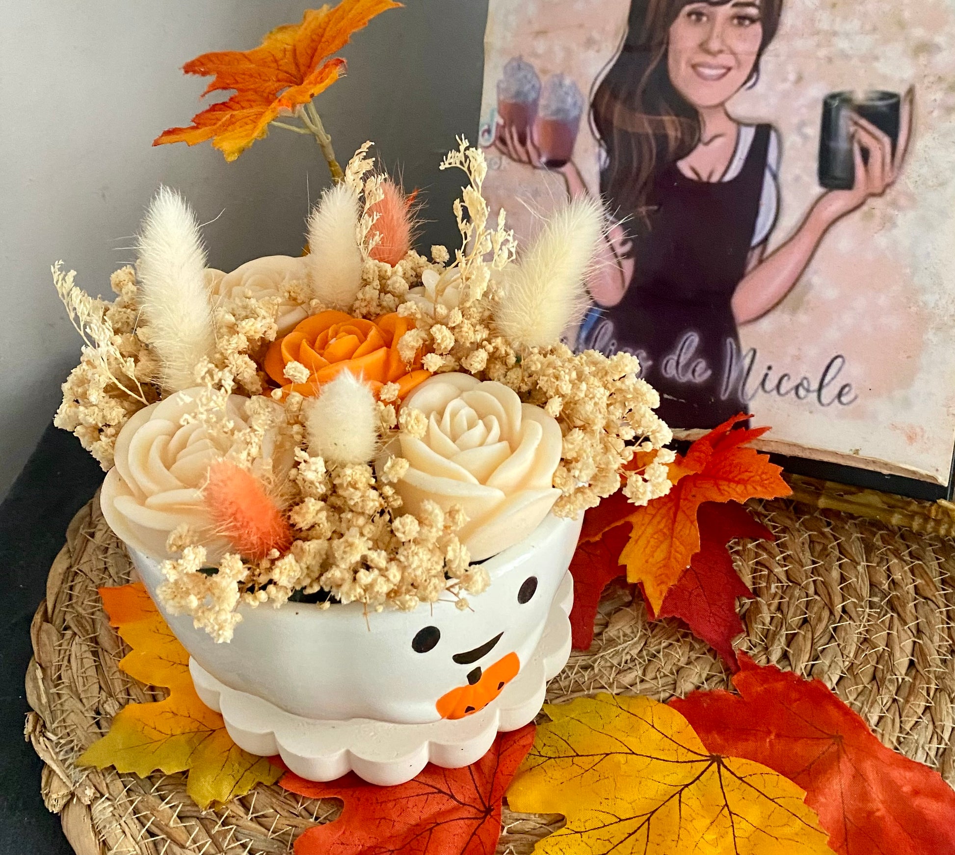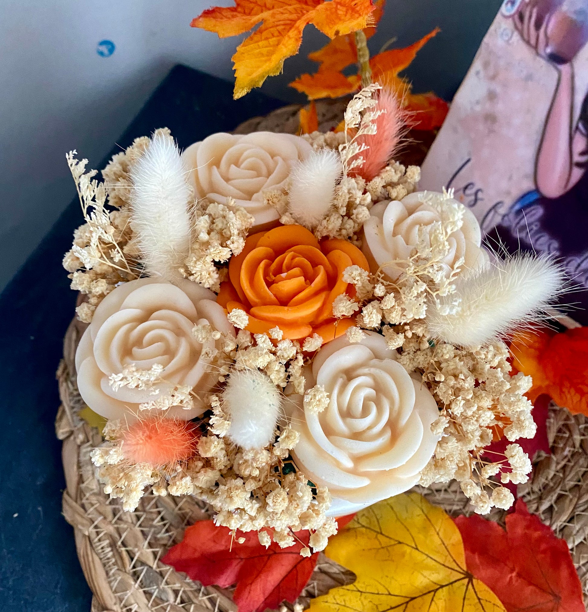 Apportez une touche magique à votre intérieur avec cette création artisanale unique : un bouquet de fondants parfumés en forme de roses, décorés de fleurs séchées aux couleurs automnales.